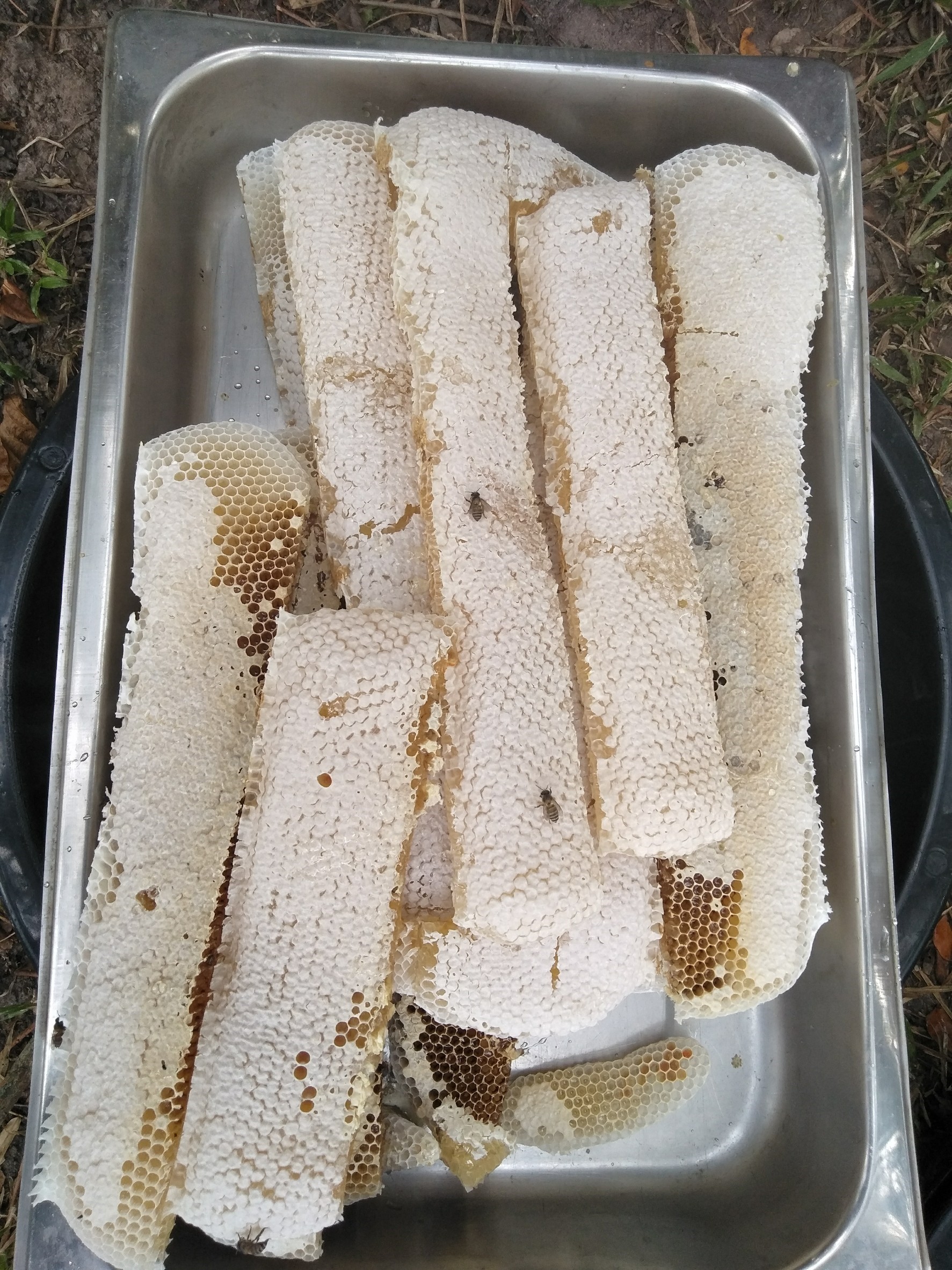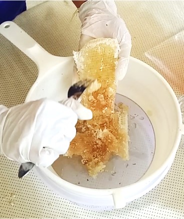2) นำรวงผึ้งมาสับหรือฝานเปิดปากรวงบนตะแกรงโดยให้น้ำผึ้งไหลลงในถังเก็บ และไม่ควรใช้วิธีบีบหรือคั้นรวงผึ้ง เพราะจะทำให้ที่ได้มีเศษผงหรือชิ้นส่วนของรวงและตัวอ่อนผึ้งปะปนอยู่ในน้ำผึ้ง