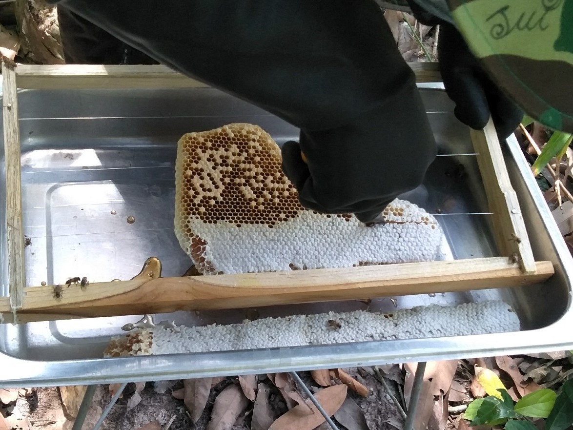 1) ใช้มีดตัดรวง เฉพาะส่วนที่เป็นรวงน้ำผึ้งที่ปิดฝาหลอดรวงแล้ว