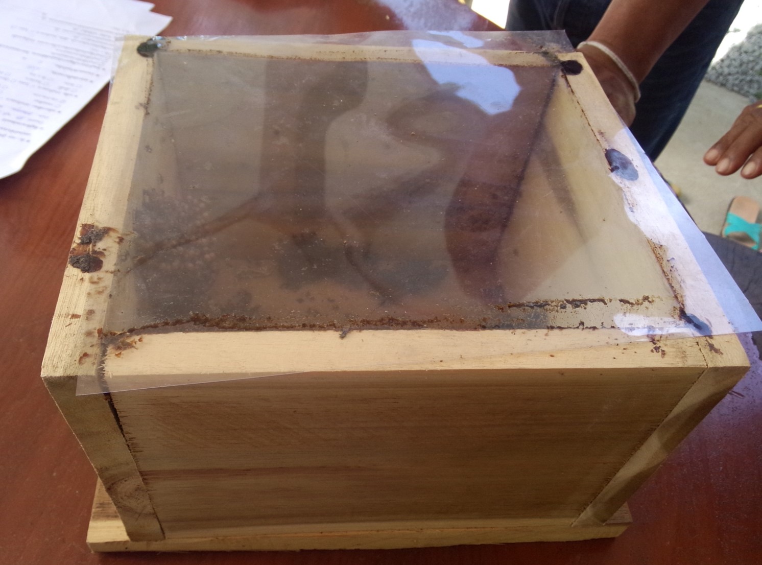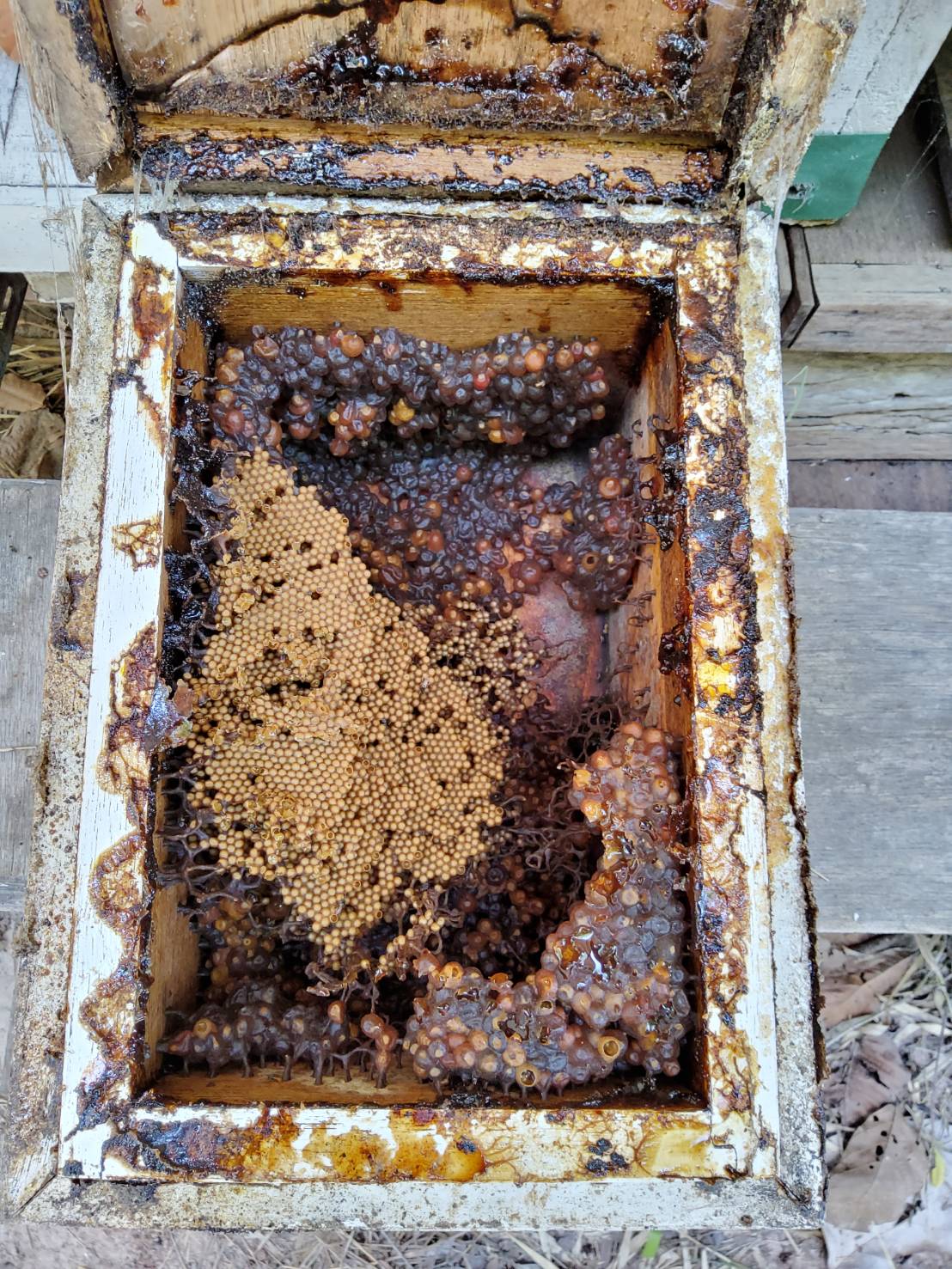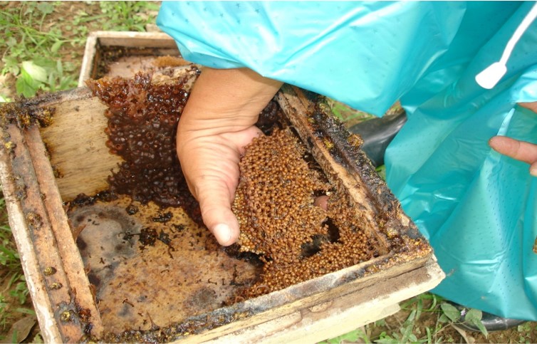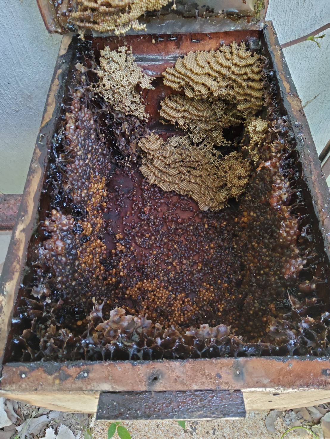 3. ทำการแยกกลุ่มดักแด้ที่มีหลอดนางพญาหรือถ้าไม่พบหลอดนางพญาให้คัดเอากลุ่มดักแด้กลุ่มใหญ่่ออกมาใส่ในรังที่ต้องการแยก และสำรวจดูนางพญาชันโรง ถ้าพบนางพญาให้เอานางพญาไว้ในรังเดิม