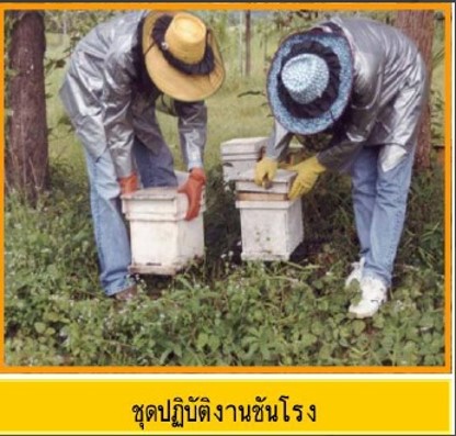 8. ชุดปฏิบัติงาน ควรเป็นชุดที่ทำจากผ้าร่มและมีสีอ่อน ๆ เช่น สีขาว ถ้าเป็นสีเข้ม ชันโรงงานจะกัดและเกาะติดผ้า โดยจะกัดไม่ปล่อยและตายในที่สุด