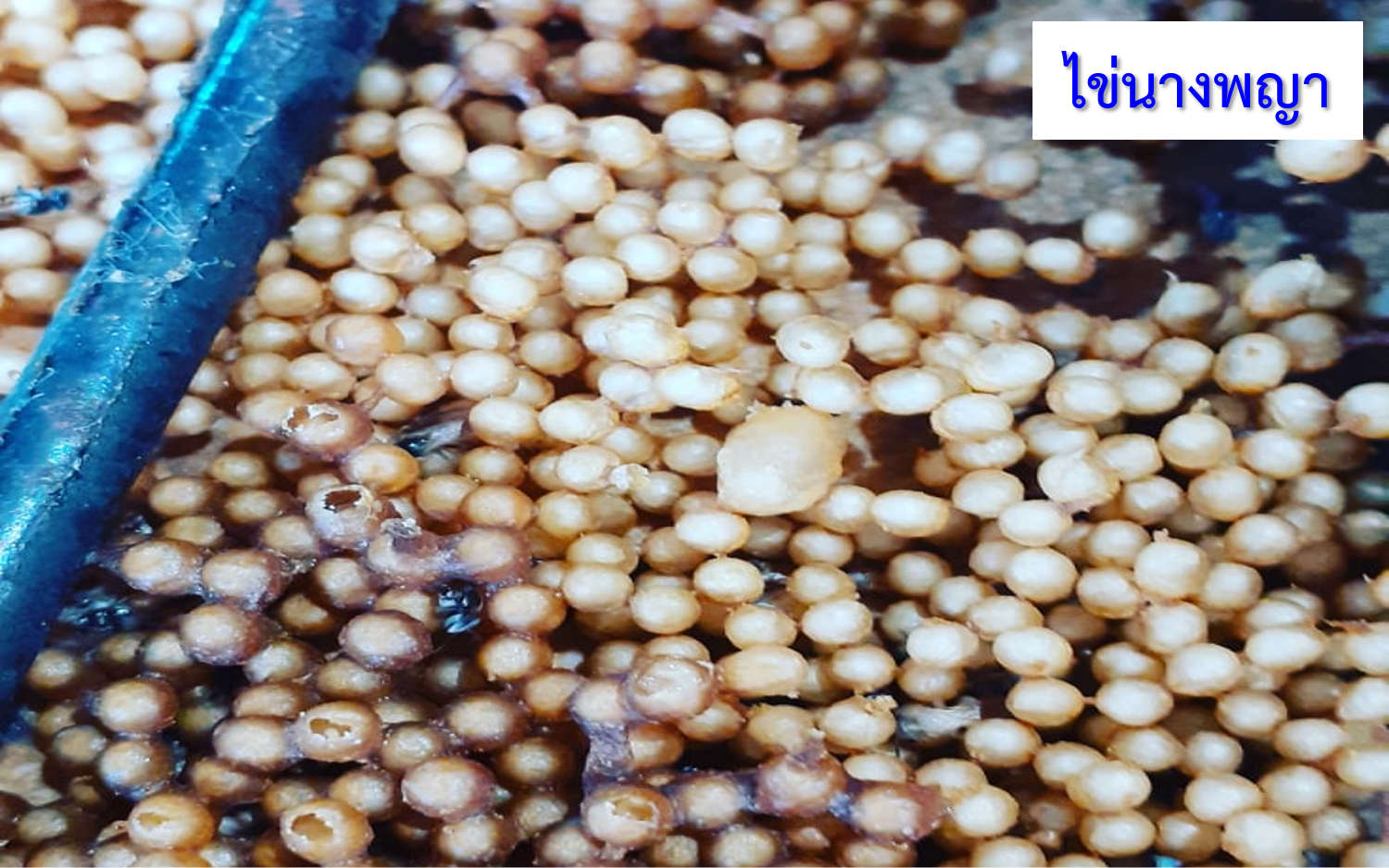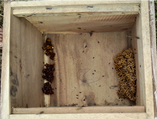 4. นำถ้วยอาหาร (ถ้วยเกสร/ถ้วยน้ำผึ้ง) จากรังเดิมใส่ลงในรังที่แยกใหม่ โดยนำถ้วยอาหารวางใกล้ปากทางเข้า ออก ของรังที่แยกใหม่