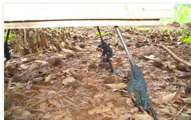 7. การแยกรังเลี้ยงชันโรง ควรเตรียมวัสดุกันศัตรู โดยเฉพาะพวกมดที่ชอบกินน้ำหวานและทำลายหลอดดักแด้ของชันโรง ทำให้การแยกขยายรังชันโรงเสียหาย ป้องกันโดยใช้น้ำมันเครื่องเก่าทาตามขาตั้งหรือกลักที่จะนำรังไปตั้งเลี้ยง
